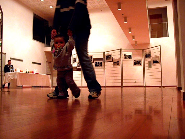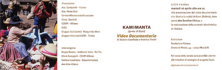 L'Auditorium della Fondazione Ferrero con gli ospiti della serata. Hanno assistito alla proiezione circa 450 persone. I partecipanti alla presentazione (da sinistra): Efrem Fumagalli (di COOPI), don Gino Chiesa (il fratello di padre Serafino), Claudia Apostolo (RAI Tre), Stefano Cavallotto e Federico Tinelli (gli autori del documentario). Un piccolo visitatore della mostra fotografica su Kami di Stefano Serra. Ancora visitatori della mostra fotografica.