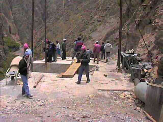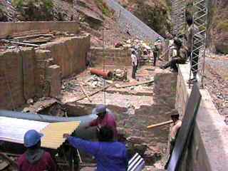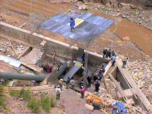 Vista panoramica dell'opera di presa: si noti il ciglio della traversa lungo tutto il lato destro della foto, a quota leggermente più elevata dell'imbocco del tunnel di presa (a destra degli uomini). Quando la portata sarà molto elevata l'acqua defluirà anche oltrepassando il ciglio della traversa. Quando l'acqua è in minori quantità (come nella foto) tutta l'acqua viene captata. |